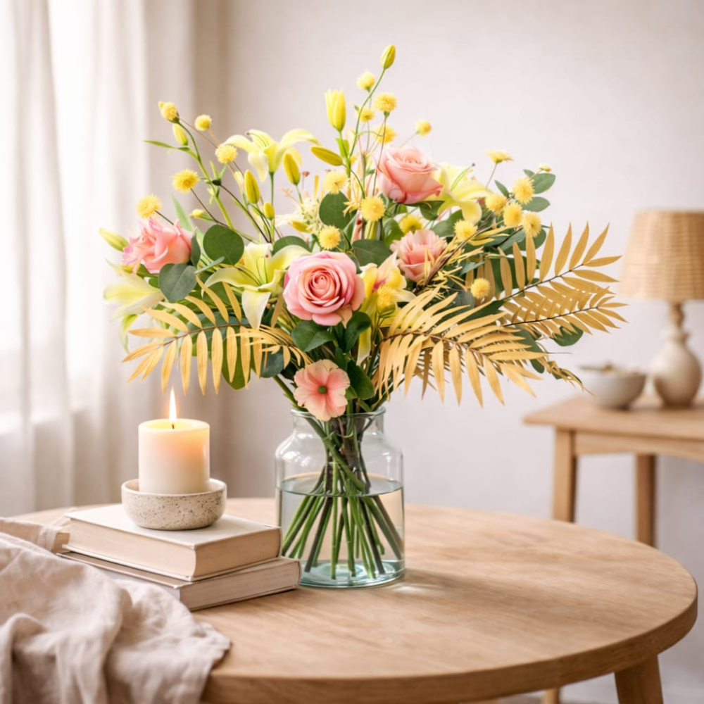 Ons zijdenboeket Peachless straalt licht en vrolijkheid uit, gele tinten gecombineerd met peach en zacht roze een tijdloos boeket die het altijd goed doet. Bloemen in de kleuren geel & peach gecombineerd met grijstinten maakt dit boeket de Nummer 1 van onze zijdeboeketten. Wij hebben het boeket los geschikt zodat het een mooi uitbundig zomerboeket is. De zijdenbloemen die wij gebruiken in dit boeket zijn van een mooie kwaliteit en lijken ‘net echt’. Geniet lang van je mooie boeket! Het boeket wordt compleet geleverd met glazen vaas. Het geleverde boeket kan licht afwijken van de foto.