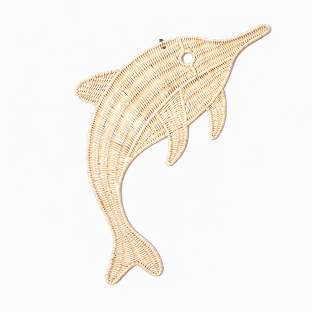 Deze vrolijke rotan wanddecoratie in de vorm van een dolfijn brengt direct een speelse en natuurlijke sfeer in de ruimte. Het handgemaakte ontwerp van natuurlijk rotan zorgt voor een warme uitstraling en maakt deze wanddecoratie perfect voor de babykamer, kinderkamer of een zomerse woonstijl.